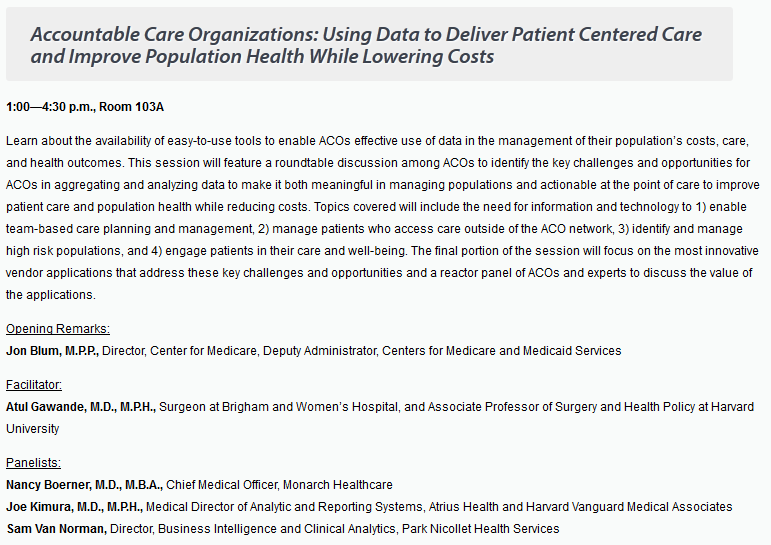 When I saw that he was faciliating a breakout session at ‘Health Datapalooza‘ aka HDI Forum III or as some would label it the ‘friends of Todd Park love in’, titled ‘Accountable Care Organizations: Using Data to Deliver Patient Centered Care and Improve Population Health While Lowering Costs‘ I thought I finally get to shake his hand and thank the public health colleague in person for his incredible work.