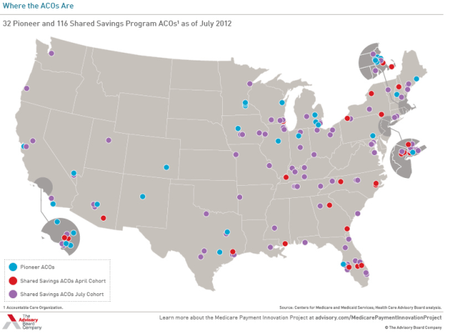 We all love infographics, right? Well, courtesy of the good folks at The Advisory Board, aka @TheAdvisoryBd check out the updated map and associated legend to track with the incidence of certain ACO model types as they inevitably pepper the US landscape.