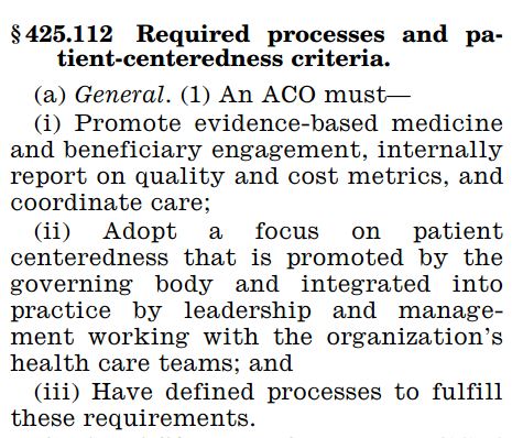 Also consider the balance of criteria or so-called CMS ‘indicia’ of patient centered-ness via Section 425.112: Required processes and patient-centeredness criteria: