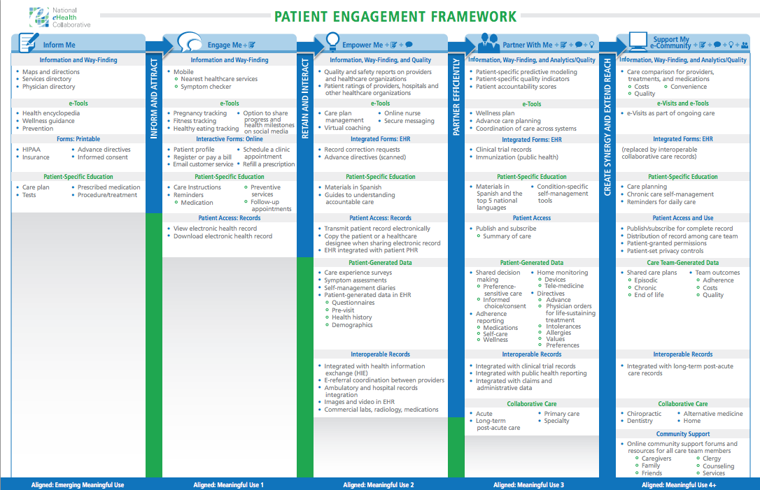 Now consider the crosswalk and ‘best case(?)’ staged implementation timeline perhaps most accurately reflected in the National eHealth Collaborative’s ‘Patient Engagement Framework’.