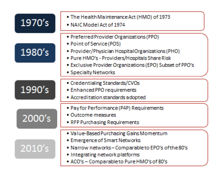 In the mid 80s principally in California Preferred Provider Organizations (PPOs) emerged and launched the era of discounted fee-for-services contracting for hospital, physician and ancillary services. PPOs were an HMO-lite version as members/beneficiaries voted with their feet within the network based on ‘in network’ benefit plan incentives vs. the closed loop (gatekeeper) HMO model.
