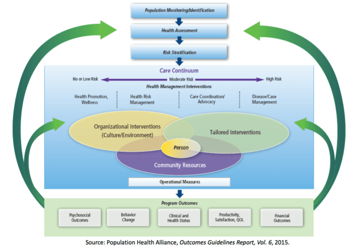 In its simplest framework, one can think of a population health program in terms of the following components as articulated by the Population Health Alliance Outcomes Guidelines Report Volume 6, 2015.