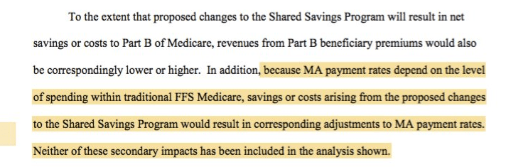 But wait! There’s lots of evidence that the benchmark underestimates the savings produced. @JMichaelMcW et al have shown convincingly that a true “difference in difference” approach would show substantially higher net impact. The green eyeshades folks at CMS OACT said add 60%.