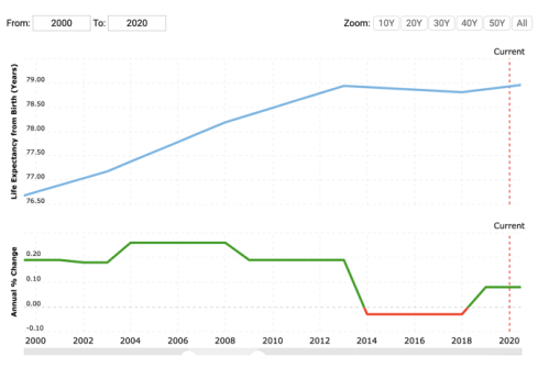 average projected lifespan of 76.7 years (74.1 for men and 79.5 for women). There are stark disparities in the range, though, if you drill down into the details (we’ll come back to that later):