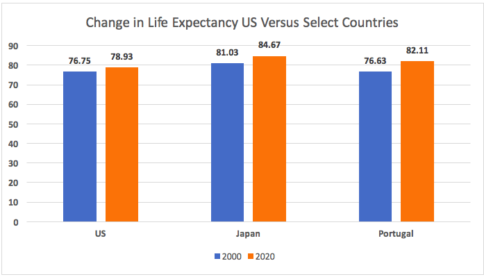During this 20 year period, the U.S. performed poorly, registering a modest increase of just 2.2 years overall. The rate of increase was affected by the fact that we actually experienced a reduction in Life Expectancy from 2014 through 2017 and a modest 0.1 increase in 2018 per a recent CDC report released January 30, 2020. During the same period, Japan showed a positive increase every year, and Portugal, which started slightly behind the US, showed a positive increase every year AND increased their Life Expectancy by almost 5 years,
