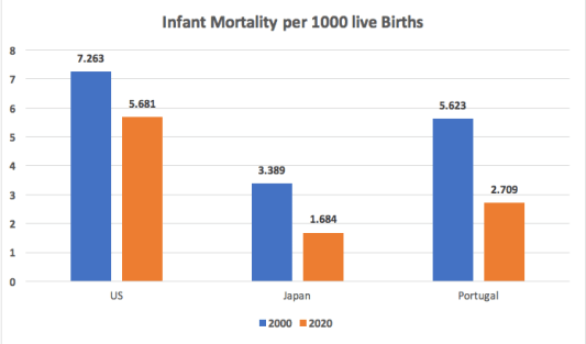 The US began the period with a higher infant mortality rate than either Japan or Portugal, and although we lowered our rates, so did they…and they outperformed us in terms of improvement, even though they began the period with lower mortality rates!