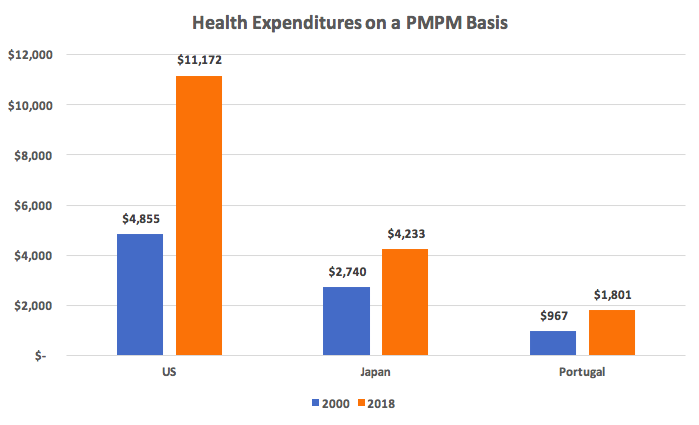 “By 2000, health expenditures (in the U.S.) had reached about $1.4 trillion, and in 2018 the amount spent on health had more than doubled to $3.6 trillion. On a PMPM basis for the same time period the US increased 130% while Japan increased 55% and Portugal 86%.