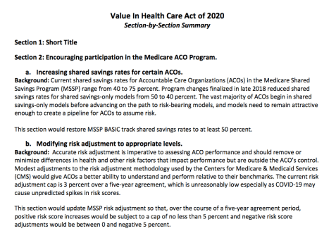 ‘further strengthen ACOs and APMs and ensure their continued success. We are pleased that the bill provides appropriate shared savings rates, modifies risk adjustment methodologies, removes barriers to participation, ensures fair and accurate benchmarks, and provides educational and technical support for ACOs. The bill also makes important steps to reinforce the transition to value through extending and modifying Advanced APM bonuses and addressing aspects of APM overlap. These reforms will ensure that value-based care models continue to be viable for physician and hospital participants’